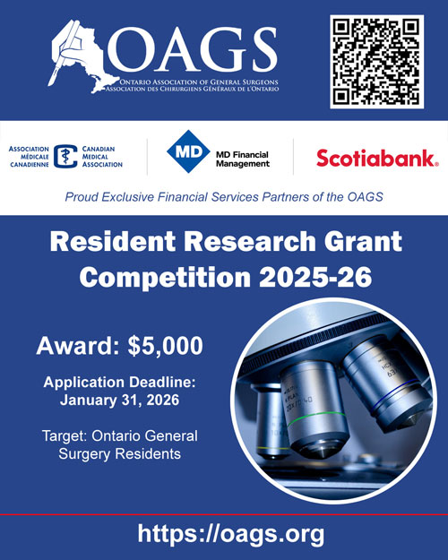 Attn. ON General Surgery Residents #OntarioCanada🍁 - 2025-26 OAGS Resident Research Grant Competition is now OPEN!! Submission deadline: Jan.31. @MD_Financial @scotiabank @CMA_Docs #generalsurgery #ResidentResearch Details: https://t.co/Y8vjlpjgEd pic.twitter.com/FnreWHEl9M